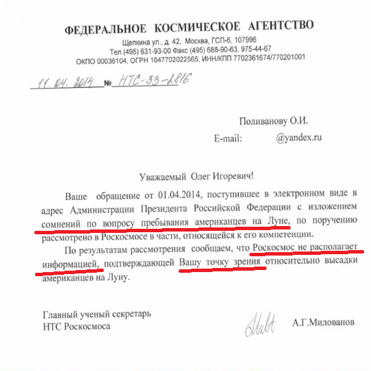 И эти официальные ответы «Роскосмоса» с просьбой документально подтвердить высадку американцев на Луне со стороны СССР или России уже не первое. Напоминаю о предыдущем ответе «Роскосмоса»: