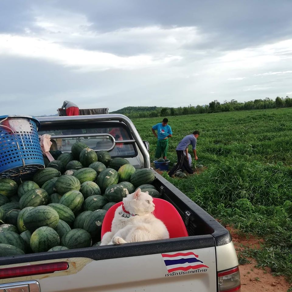 Белый котик из Таиланда прославился в Фейсбуке своим злобным взглядом и способностью использовать его во имя охраны арбузов своих хозяев. Его зовут Жемчужина, и одна из фотографий с ним стала вирусной, а всё благодаря сочетанию нескольких вещей: его взгляду и лапе, положенной на арбуз.