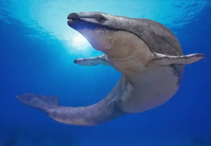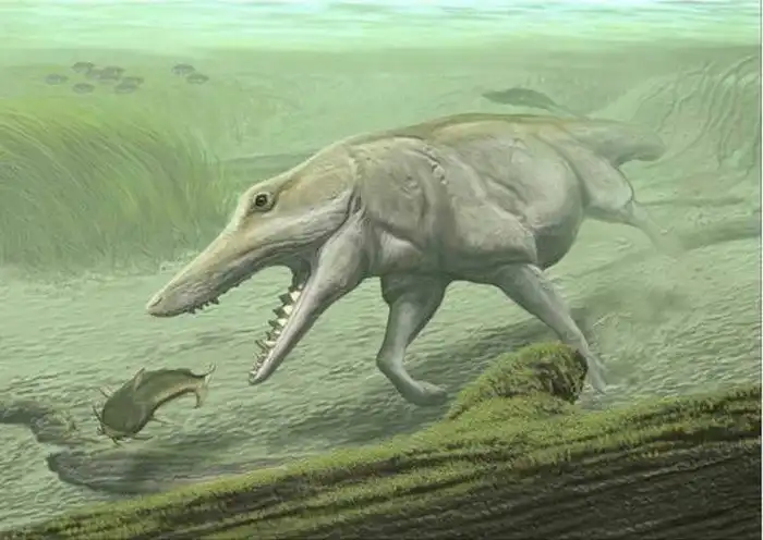Далее идут базилозавры и дорудонтиды. Они выглядели почти как нормальные киты, ведь имели хвостовой плавник. Но имели мелкие задние конечности для поддержки партнера во время спаривания и крохотный мозг. А еще они не могли в эхолокацию, как современные киты.