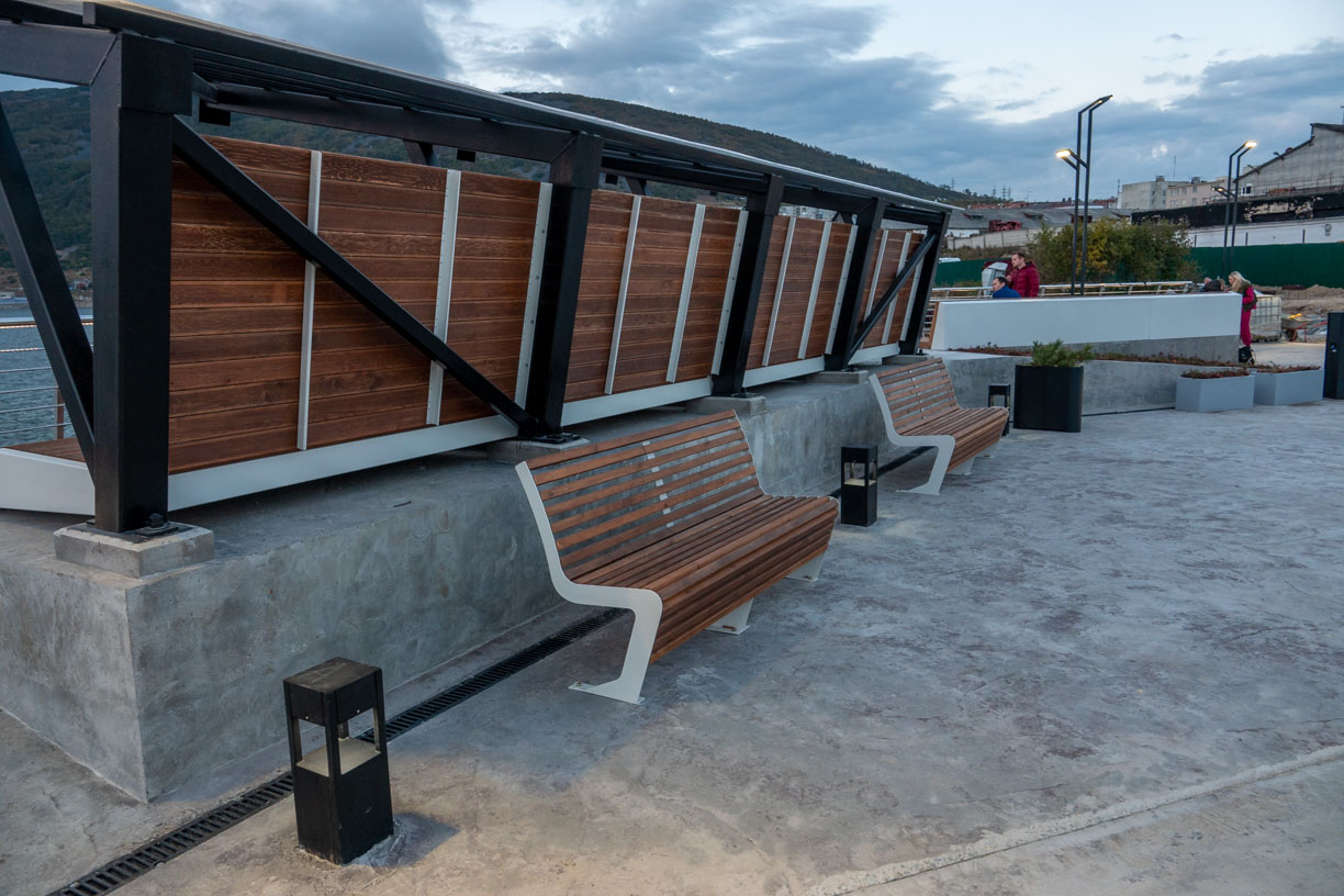 Половина пирса уложена палубными досками. Для укладки полов и лавочек использовались только доски экстра-класса, полученные из самой сердцевины деревьев, где нет ни одного сучка. Материал – уральская лиственница, она не боится воды, а, напротив, становится только прочнее от влажности. После обработки такой материал выдерживает любые погодные условия.