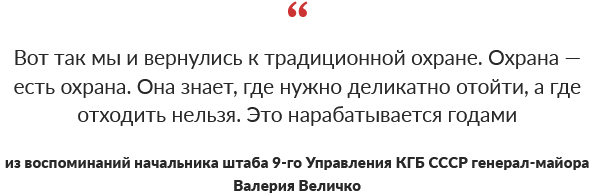 Сама же «девятка» отныне была нацелена лишь на охранные функции. К слову, некоторые сотрудники службы личной безопасности Горбачева выступили за более радикальные перемены — а именно вывод управления из подчинения КГБ и его передачу под прямое руководство самого Михаила Сергеевича.