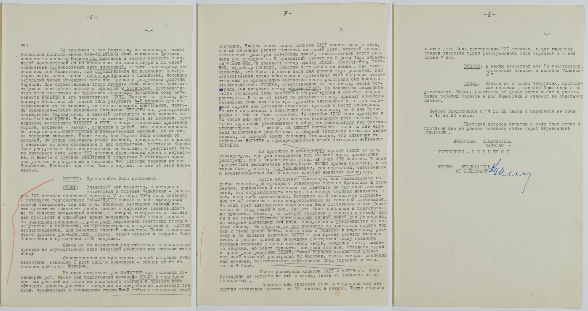 «13 октября 1942 года, примерно в 12 часов дня, мне была дана команда командиром роты выехать с тремя грузовыми автомашинами в оберфельдкомендатуру гор. Сталино… По прибытии в комендатуру машины зашли во двор, где уже находились под охраной люди, подлежащие расстрелу, как я впоследствии узнал, их было 120 человек...