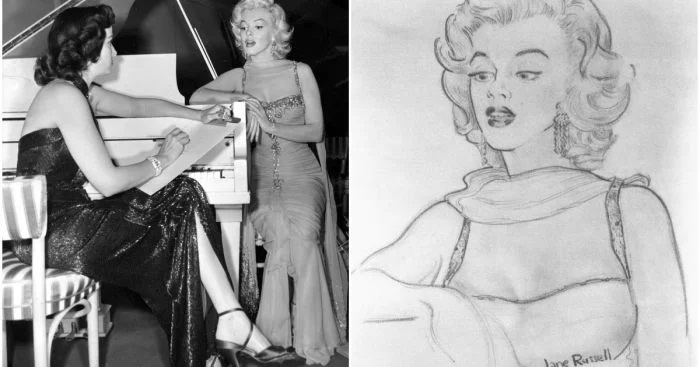 9. Актриса Джейн Рассел рисует портрет Мэрилин Монро в перерыве между съёмками фильма «Джентльмены предпочитают блондинок», 1953