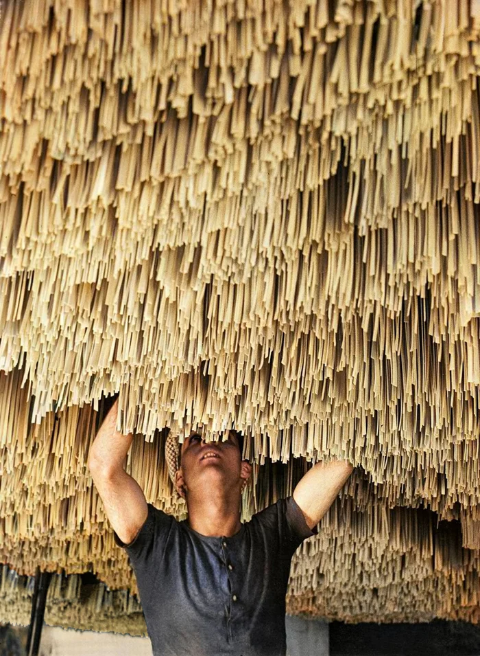 Рабочий развешивает макароны на просушку. Италия, 1932 год.