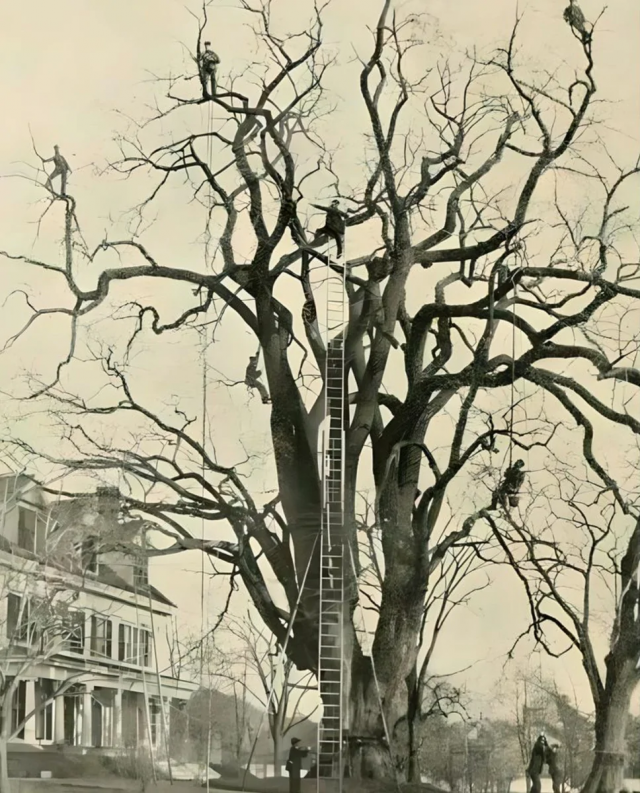 Обрезка деревьев была совсем небезопасной до изобретения ковшовых подъемников, конец 1800-х