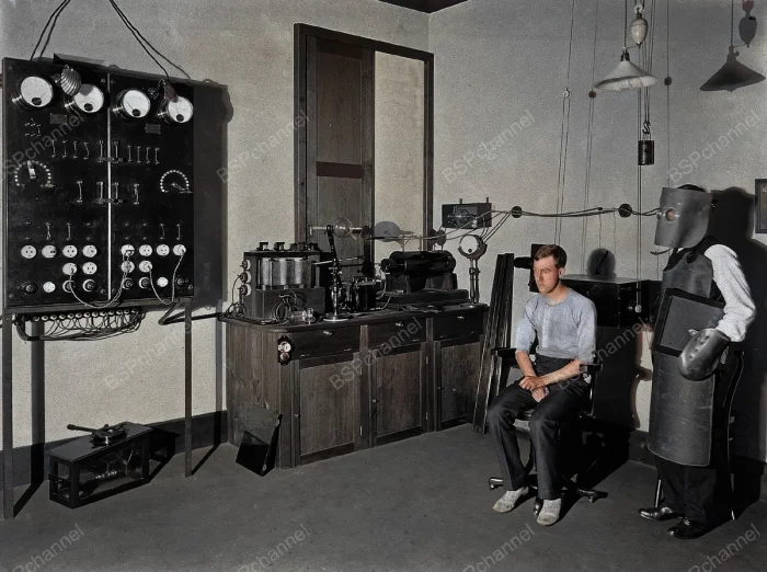 Мужчина в тяжёлом фартуке, маске и перчатках, возможно, с рентгеновским аппаратом, рядом с сидящим мужчиной. Южная Африка, Больница Йоханнесбурга, 1905 год.