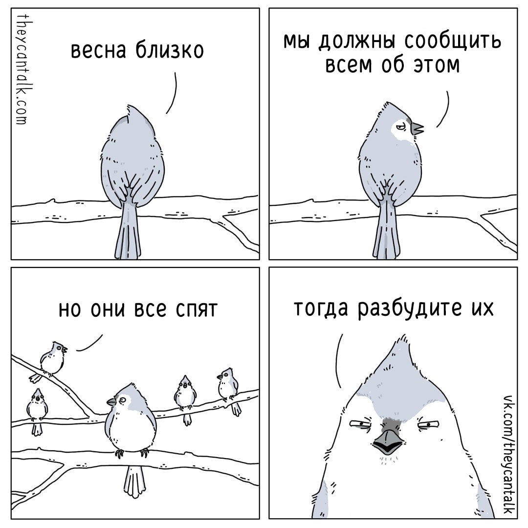 Иллюстратор по имени Джимми не стал ждать милости от природы, а взял и нарисовал занимательные звериные диалоги, представив, о чём же таком особенном те могли бы беседовать. В свою очередь, автор паблика «Вконтакте» theycantalk оказал нам всем огромную услугу, переведя эти шедевры комиксологии.