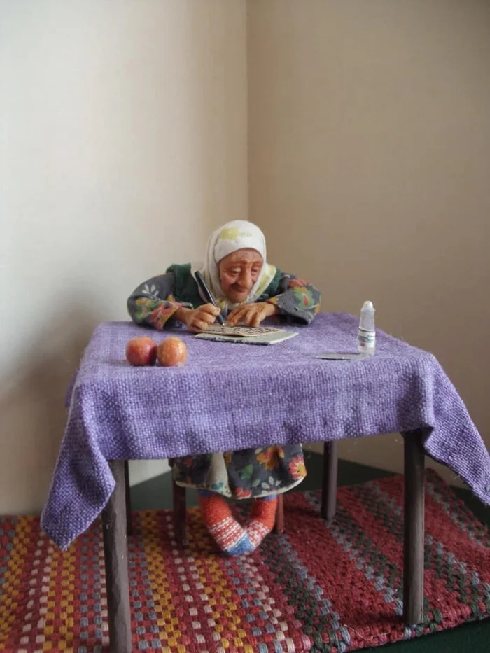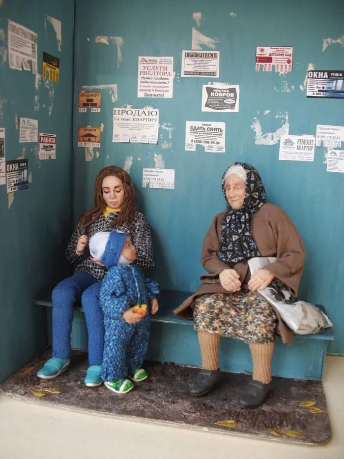 Не меньше месяца мастер тратит на создание одной композиции: сначала из полимерной глины делает лицо и руки, затем самая трудоёмкая часть – подбор одежды и интерьера. Туловище всех кукол сделано полностью из ткани. Внутри даже нет проволочного каркаса. Они могут стоять самостоятельно и держать при этом равновесие.