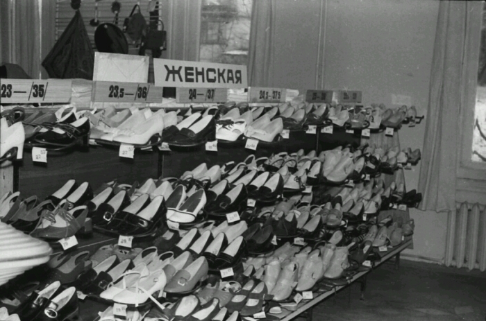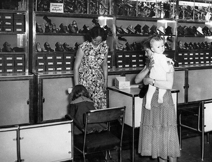 С этим товаром тоже не все было гладко. Один плюс – для пошива обуви использовали натуральную кожу, крепкую и надежную. Носили те же сапоги и туфли по несколько лет. Практически в каждом городском районе был ремонт обуви, куда она и сдавалась для замены набоек, замков, подошвы и так далее. Стоимость самых недорогих сапог на зиму составляла около 80-120 рублей.