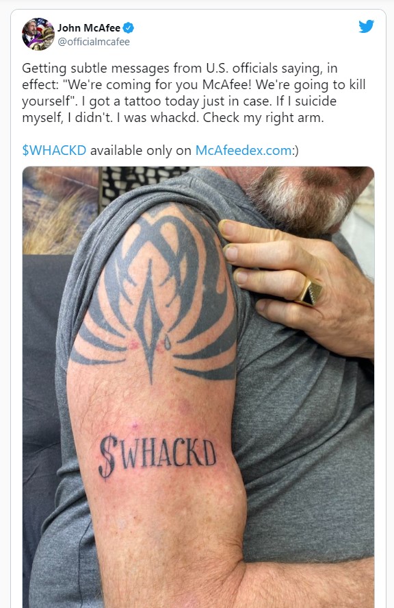 «Американские чиновники угрожают мне, по сути говоря: «Мы идем за тобой, Макафи! Мы собираемся убить тебя!» Сегодня я сделала себе татуировку [Whackd— сленговое значение, переводится как убитый] на всякий случай. Знайте, если я покончил с собой — это ложь. Я был убит. Проверьте мою правую руку», — говорится в сообщении.