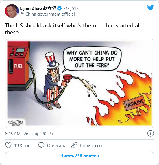 Более того, 26 февраля официальный представитель МИД КНР Чжао Лицзянь опубликовал на своей странице в Twitter карикатуру о политике США на Украине, созданную китайским англоязычным изданием Global Times. На ней изображён дядя Сэм, поливающий бензином пожар на Украине.