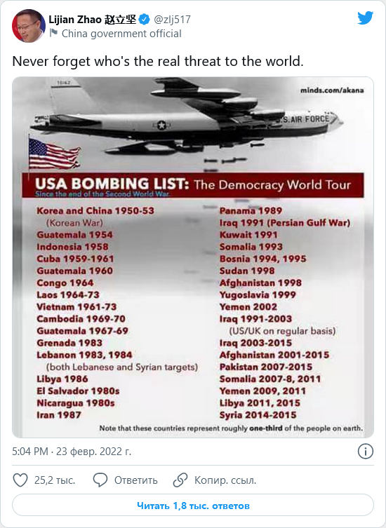 23 февраля Лицзянь разместил у себя в Twitter чёрно-белое изображение американского стратегического бомбардировщика с подписью «Никогда не забывайте, кто представляет настоящую угрозу миру». На картинке перечислены страны, которые подвергались американскому вторжению после Второй мировой войны. В списке более 30 государств.