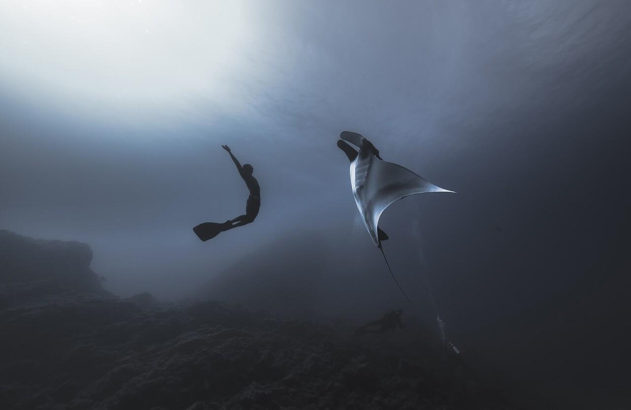 Финалист в категории «Шедевр», 2021. Фридайвер Аолин Ван с гигантским морским дьяволом (скат манта). Фотограф Джимми Сонг