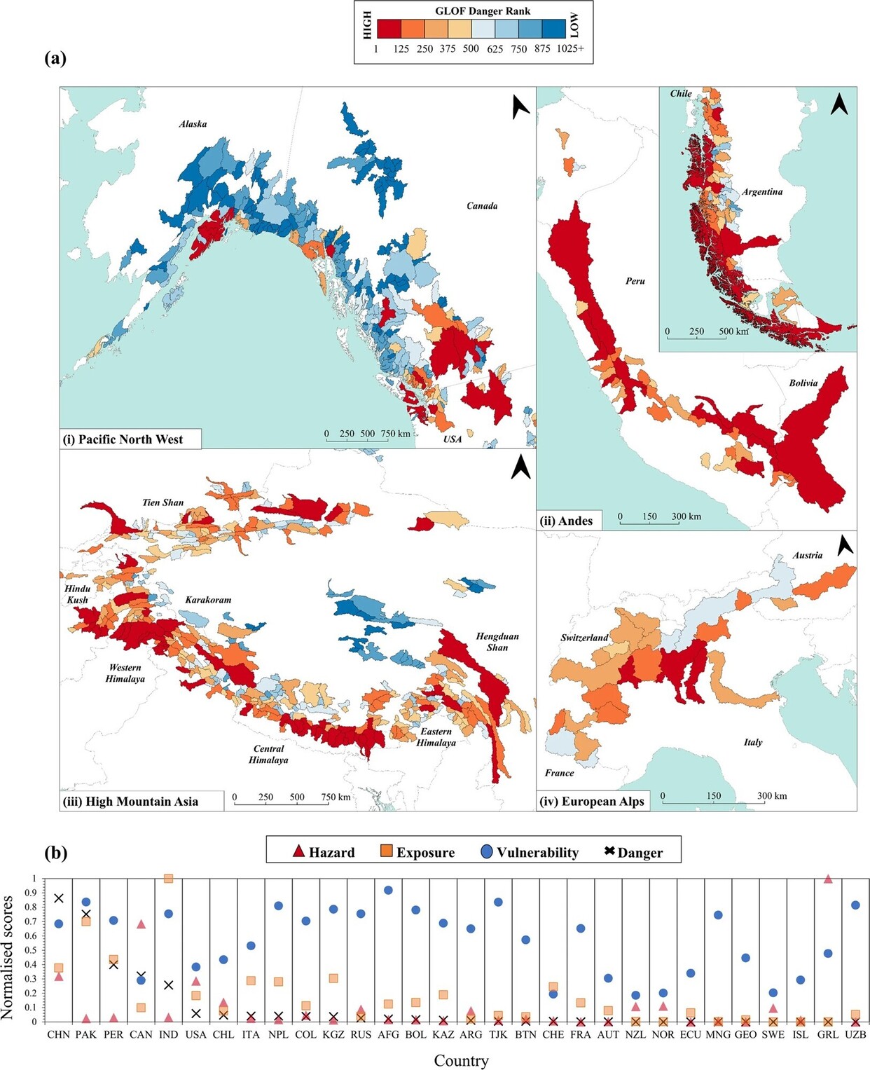 a) Пространственное распределение опасности GLOF в масштабе бассейна от высокого (красный) до низкого (синий) риска. b) Распределение уровня риска по странам. Те, кому больше всего грозит опасность, находятся левее, меньше — правее.