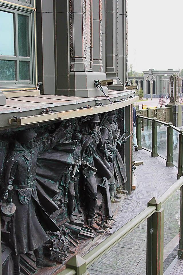 Храм растёт из земли. Чем ближе ты к нему подходишь, тем ярче это ощущение. Стены не гладкие – они все украшены рельефными орнаментами – снова отсылки к древесному стволу. У «корней» – русские воины. Снова ставшие частью родной земли. Это рельефы на стенах, изображающие ратные подвиги наших дедов, отцов, мужей и братьев. На лицах воинов застыло напряжение, волевое усилие, сосредоточение и готовность к смерти. Они стоят у корней этого храма Вооружённых Сил.