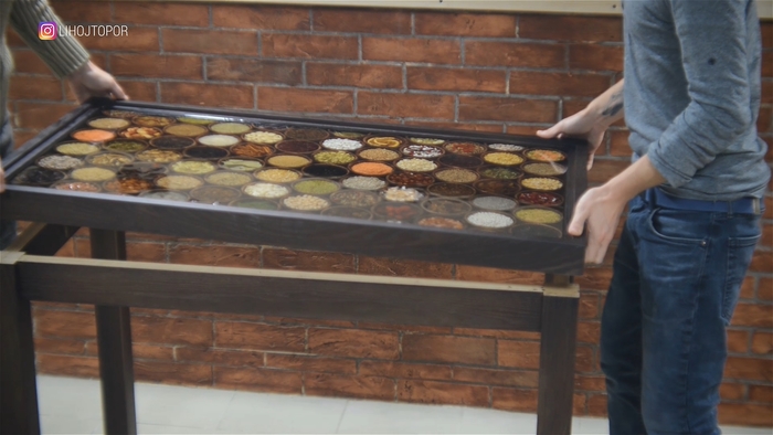 Затем финальная заливка столешницы. Для этих целей я взял состав монолит 10, и в итоге на этот небольшой стол ушло 18 кг смолы. Как вы видите, первый грунтовочный слой, сработал отлично, и все лежит на своих местах. Если честно, я был приятно удивлен, так как думал что большенство позиций очень сильно потеряют внешний вид, после заливки смолой, но по факту, они стали еще более насыщенными.
