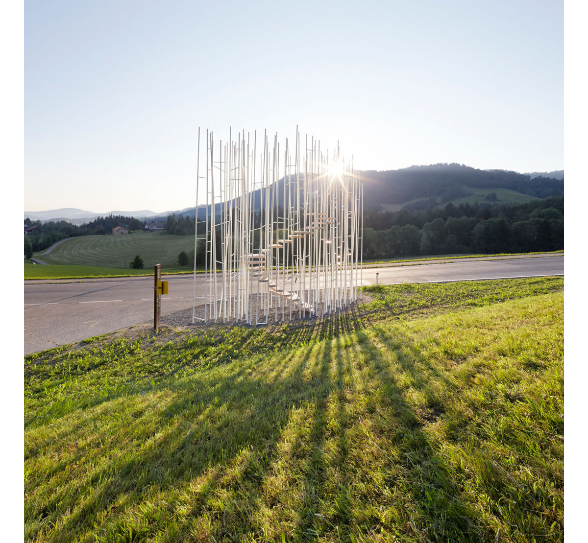 Испанские архитекторы Антон Гарсия-Абриль и Дебора Меса тоже вдохновлялись локальными традициями региона: их остановка, сложенная из необработанных дубовых досок, отсылает к традиционному способу хранения бревен в многочисленных столярных и плотницких мастерских Брегенцервальда. Таким образом, через апроприацию местной техники рождается новая архитектурная форма, при этом идеально подходящая окружающему ландшафту. Архитекторы настояли, что доски должны остаться необработанными: таким образом, фактура древесины будет меняться под влиянием времени.