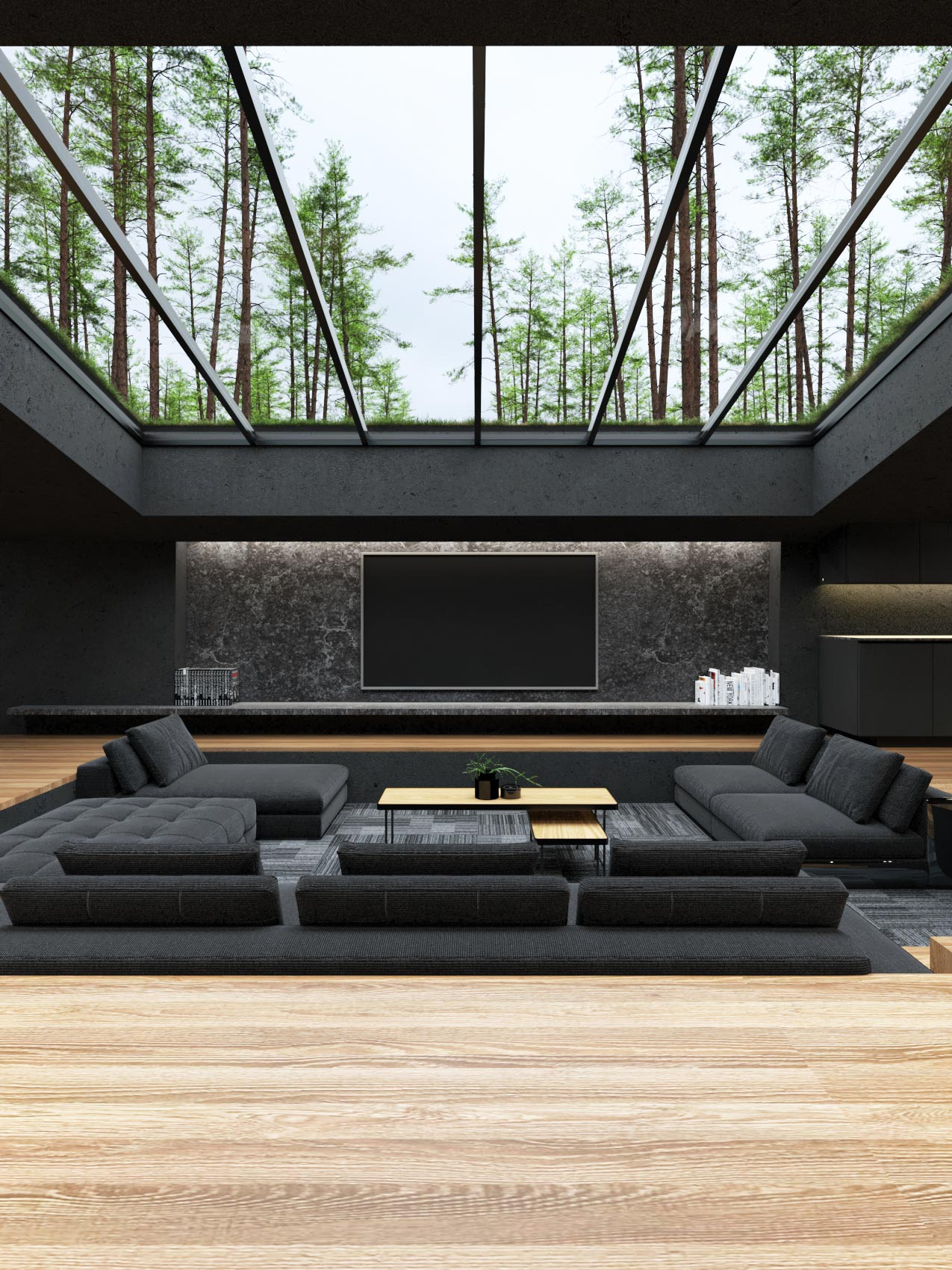 Огромный домашний кинотеатр, под стеклянной панорамной крышей, поражает размахом. В углублении пола установлены удобные диваны, большой экран закреплен на темно-серой стене. Пол украшает ковер, графитового цвета.