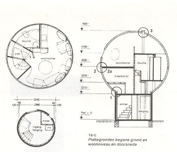 Планировка этих сооружений достаточно необычна: в центре сферы ванная комната и крошечная спальня, а чтобы попасть в гостиную и кухню, необходимо подняться на второй этаж-уровень. Всего за один день дом можно полностью разобрать и перевезти в любое другое место (вес данного сооружения всего около 1250 килограммов). К тому же данную постройку можно разместить не только на земле, но и на воде, на стационарной платформе.