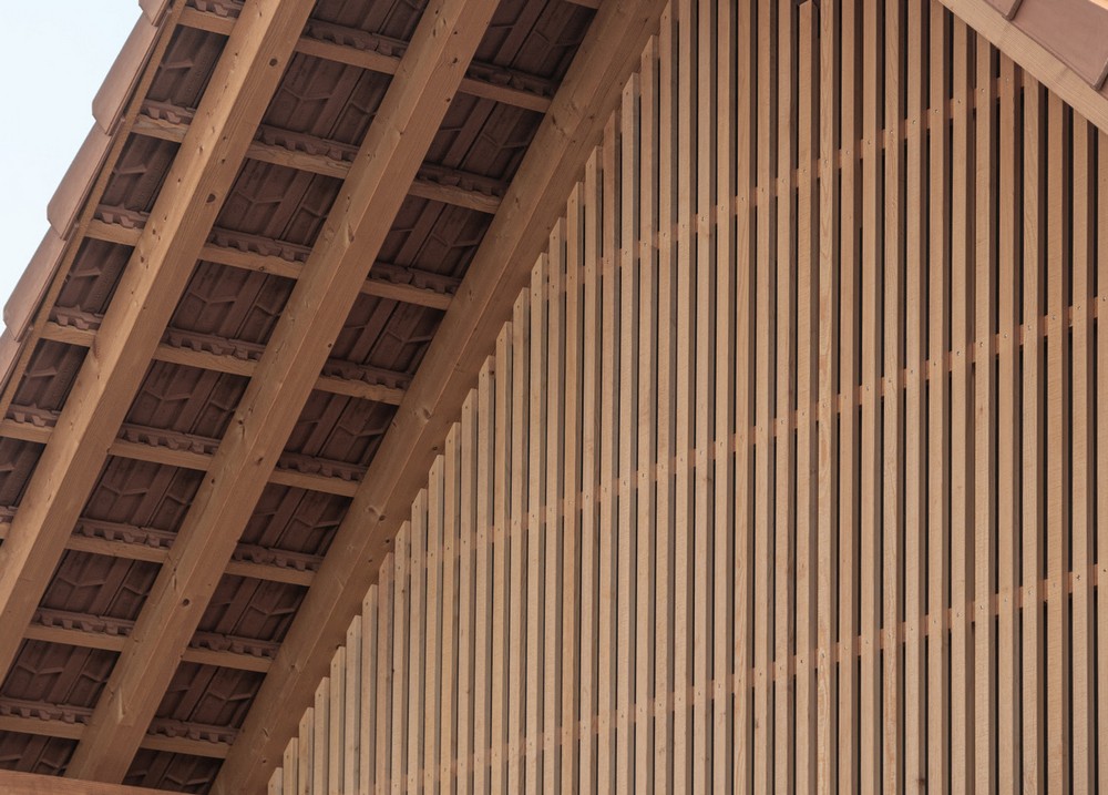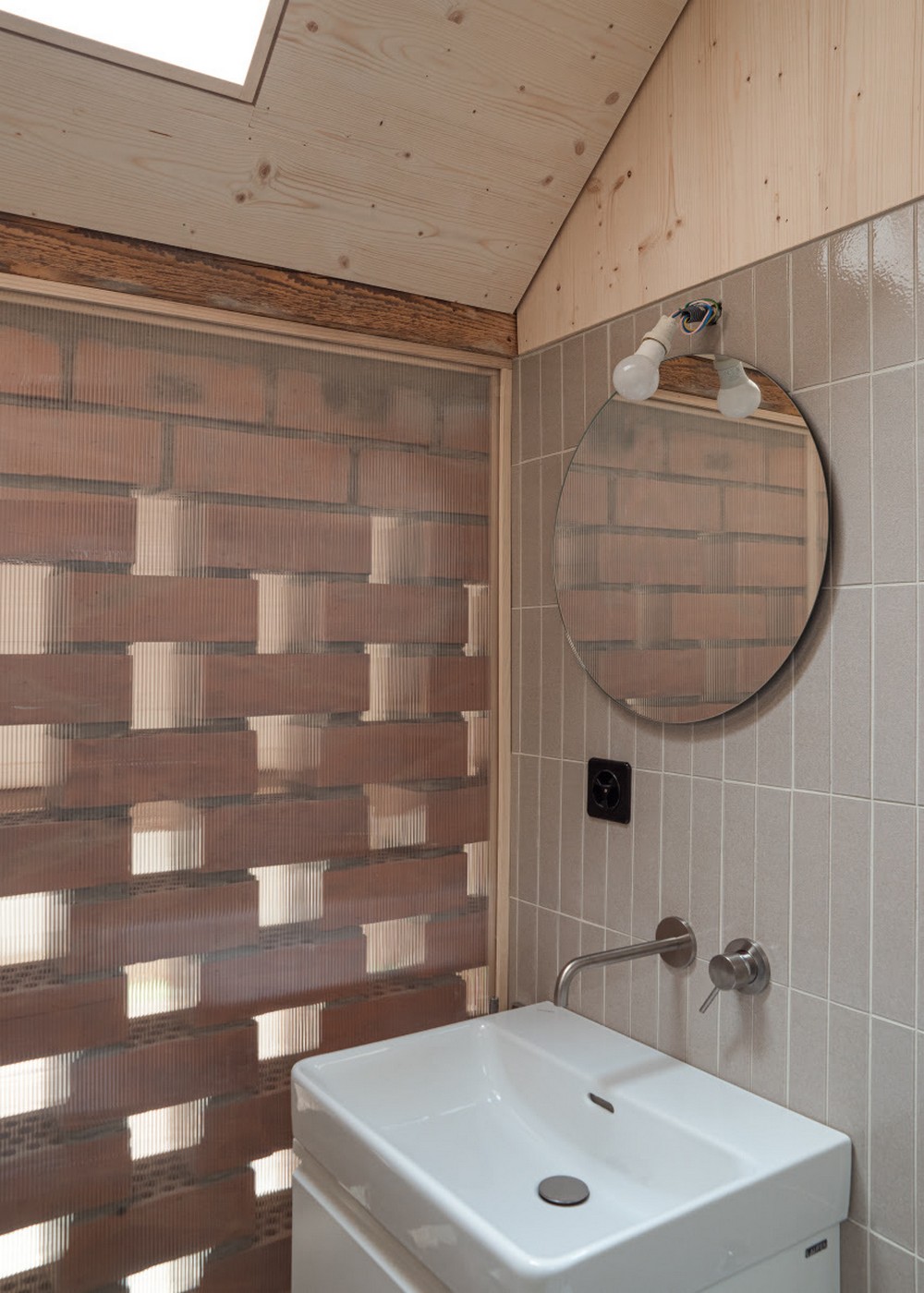 Пропорции и расположение проёмов сохранены и украшены деревянными окнами, занавешенными зелёными холщовыми жалюзи, которые перекликаются со ставнями соседнего фермерского дома. На первом этаже терраццо, состоящее из местных заполнителей, напоминает о простоте первоначальной конструкции, не имевшей фундамента. В отличие от этого, красочная кухня навязывает себя, привнося свежесть и изысканность. Наверху новая деревянная облицовка заменяет старую, чтобы гармонизировать эту часть здания — этот жест возвращает нас к первоначальному фасаду, состоявшему из деревянных досок. Некоторые части были открыты для вентиляции табака в сушилке, например, кирпичная стена, которая была восстановлена и сохранена. Последний в настоящее время действует как фильтр конфиденциальности между дневными и ночными пространствами.