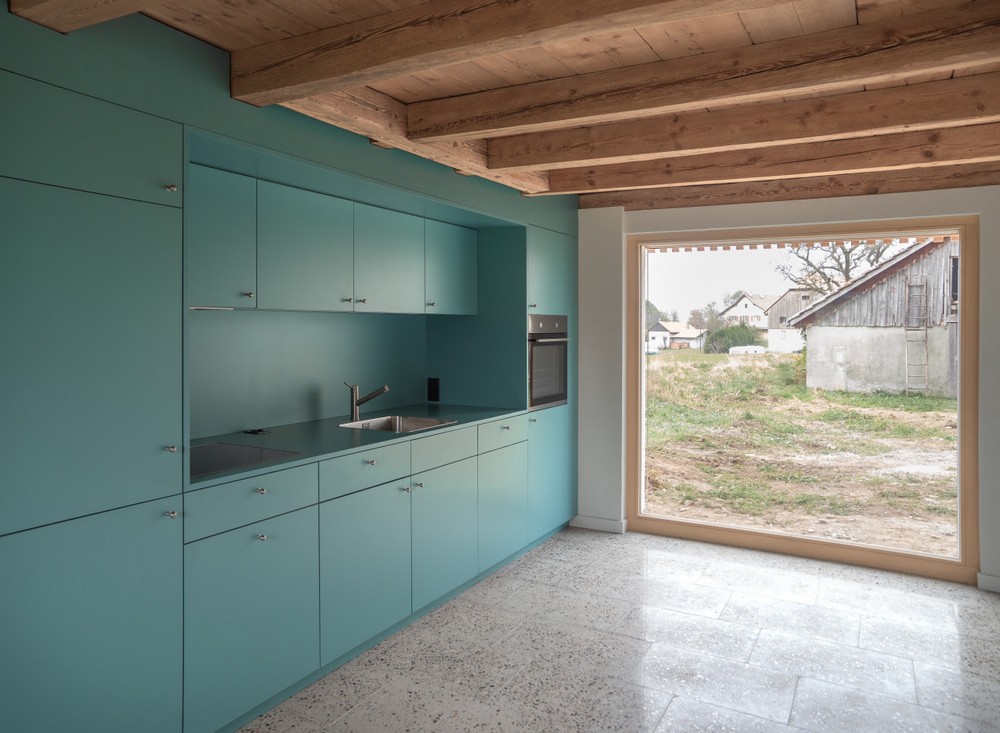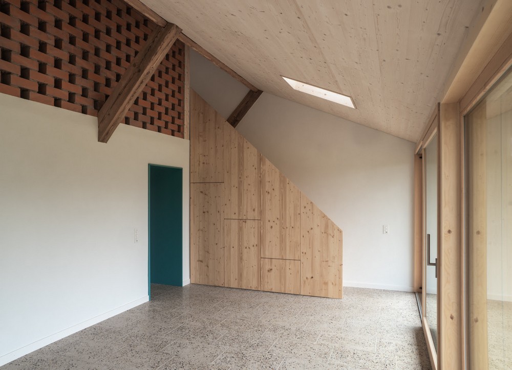 На первом этаже жилые помещения заменили старую мастерскую и курятник. Низкая высота кухни контрастирует с высотой гостиной, которая имеет большой объём. Последний ориентирован через большой эркер на поля, тем самым напоминая об отношениях здания с внешним миром. Наверху две спальни и ванная комната распределяются в месте расположения сушилки, следуя существующему каркасу. Пересечение новых перегородок с существующими конструкциями придаёт неповторимую атмосферу каждой комнате. Самобытность здания формировалась с течением времени различными заданиями и модификациями. Это приводит к определенному богатству объёмов и материальности. Чтобы сохранить его дух, его каменная основа поддерживается и покрыта штукатуркой из натуральной извести.