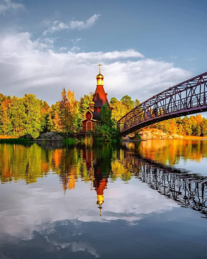 Сегодня путь по мосту — отдельное удовольствие. С него открывается панорама на плавные воды Вуоксы, сосновые леса и сам храм, который в солнечную погоду отражается в воде почти зеркально. Летом здесь особенно красиво: островок словно парит среди зелени, а зимой храм стоит, как игрушечный, среди морозных пейзажей.