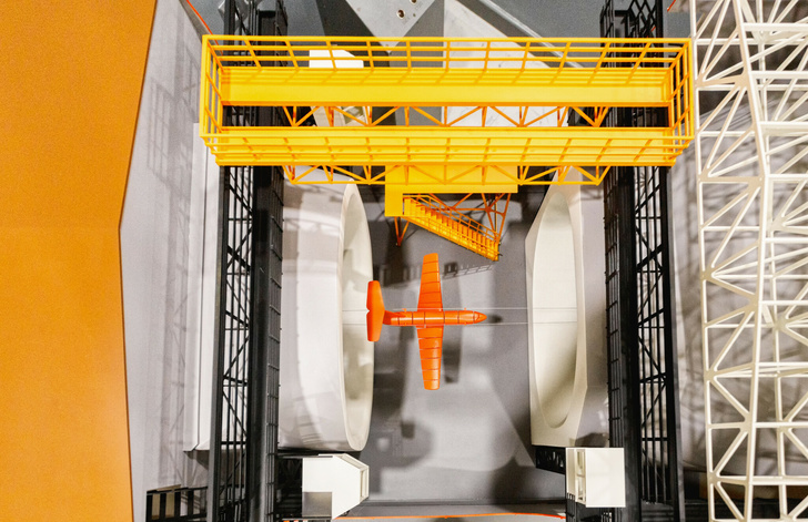 — Это вертикальная аэродинамическая труба замкнутого типа с одним обратным каналом и открытой рабочей частью диаметром 4,5 метра. Поток в трубе создает осевой вентилятор, расположенный в обратном канале. Его приводит во вращение электродвигатель мощностью 450 кВт, спроектированный и изготовленный заводом «Электросила» в 1940 году. Изначально он разрабатывался для подводных лодок и уникален своим вертикальным расположением.