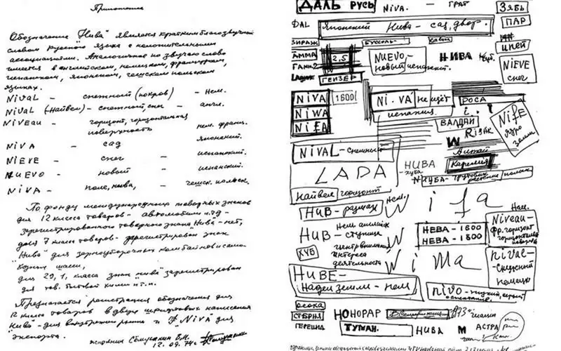По другой версии, название для ВАЗ-2121 придумал дизайнер Валерий Семушкин, который к тому же проверил благозвучие слова «нива» на других языках. На фото — чудом сохранившиеся записи дизайнера.