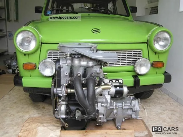 Силовой агрегат «Трабанта». Немцы довольно быстро отказались от воздушного охлаждения и перешли к классическому водяному, но двигатель по-прежнему был двухцилиндровым двухтактным мощностью 26 л.с. (изначально 18 л.с.).