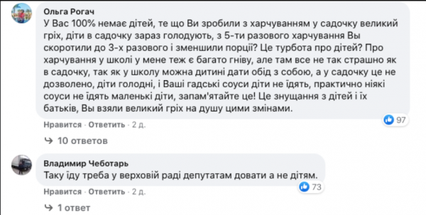 »В Одессе уже в садах убрали соль сахар вообще и хлеб. Считаю это бредом. Дети и так маленькие плохо едят, а еще и не соленое и не сладкое. Я не говор, что там надо прям насаливать и килограммами сыпать сахар, но и убирать полностью тоже не вариант. Порции уменьшили зато цену с 37 грн подняли до 45 потому, что овощи добавили", — пишут в комментариях шеф-повару.