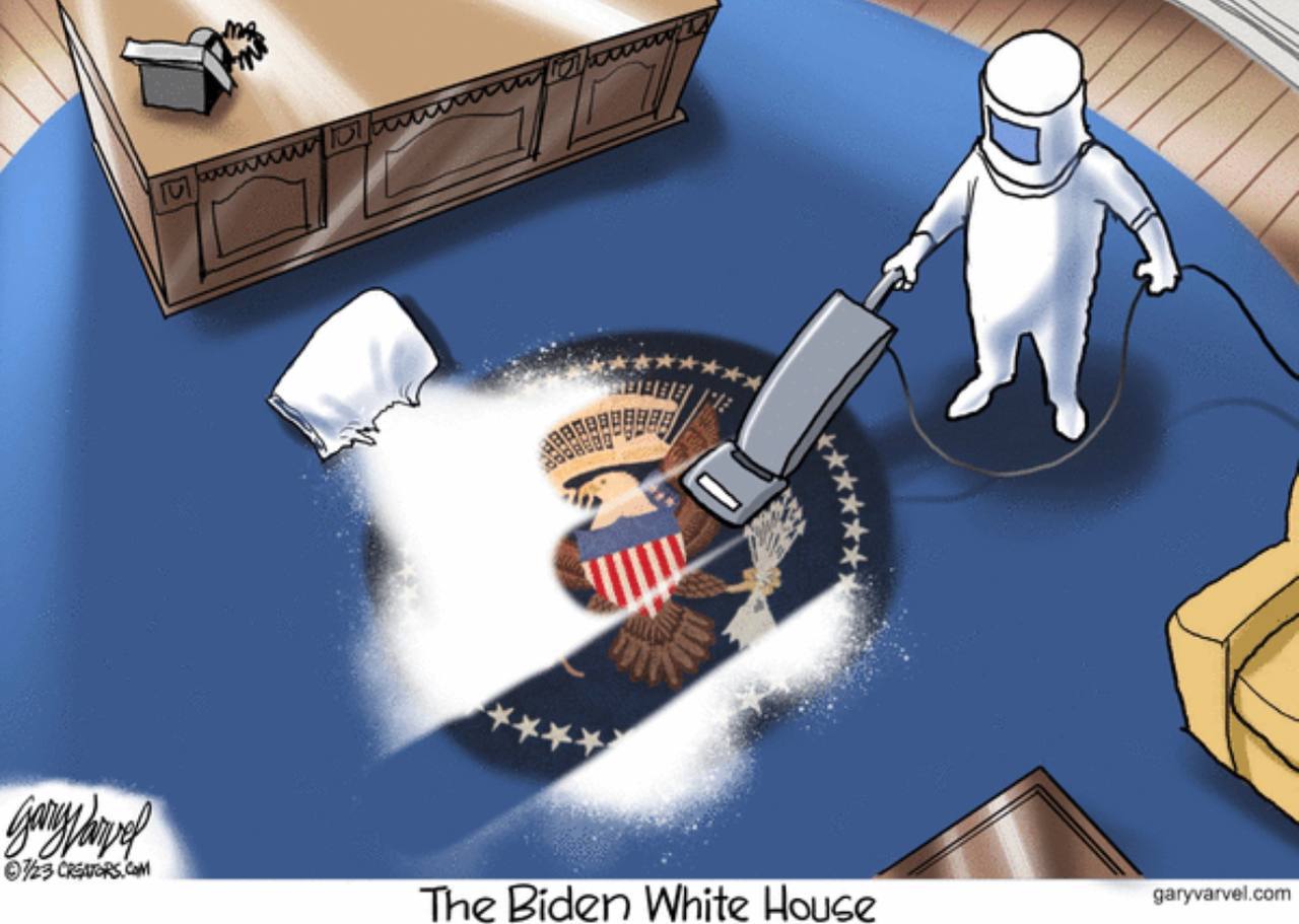 В резиденции президента США повсеместны две вещи: ковры и наркоманы. А еще там шастает Хантер Байден, который носит кокс целыми пакетами и прячет его в кладовке напротив ситуационной комнаты, чтобы сотрудникам не надо было далеко бегать за порцией вдохновения. Сотрудники-наркоманы нюхают свой порошок, порошок просыпается на ковры и забивается в ворс. Затем эти ковры нюхают собаки президента, втягивают носом порошок – и становятся похожими на Зеленского.