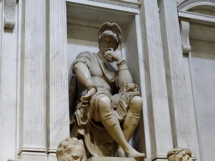 Микеланджело работал еще над одним грандиозным проектом усыпальницы — капеллой семьи Медичи при соборе Сан-Лоренцо во Флоренции; тут он проявил себя и как архитектор, и как скульптор.