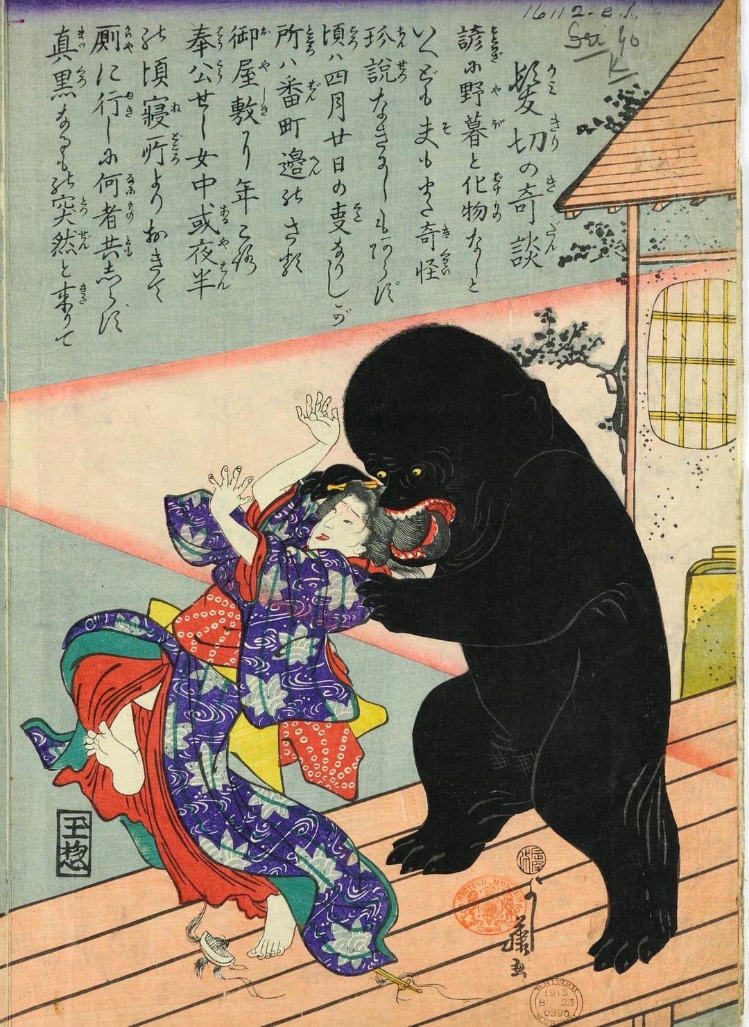 Женщина подвергается нападению камикири («стригущего волосы» ёкая) по пути в туалет. Японская гравюра 1868 года