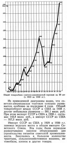 Общий товарооборот между СССР и США за 1938 г. достиг небывалых размеров – 501,1 милл. руб. При этом экспорт СССР в США в 1938 г. составил 143,8 милл. руб., а импорт СССР из США – 357,3 милл. руб. То есть импорт был в 2 с лихом раза больше экспорта.