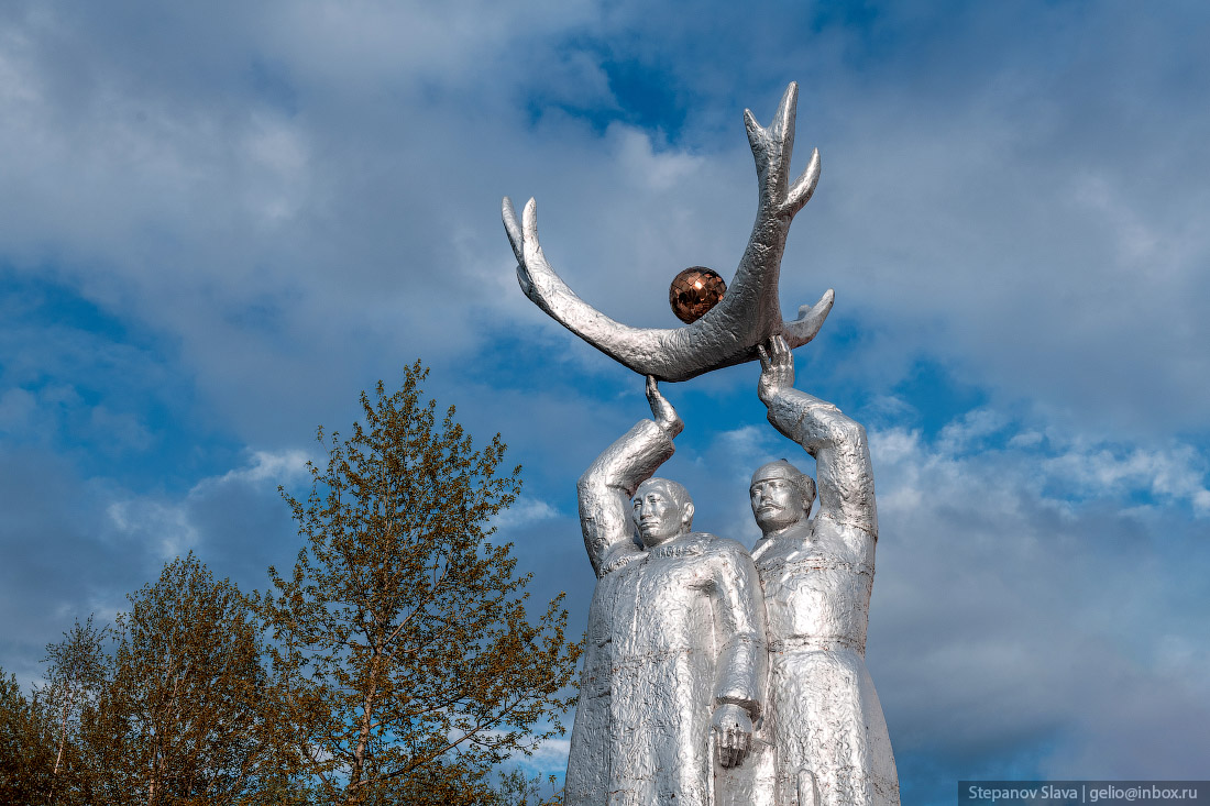 30. Памятник первооткрывателям — якуту Тарабукину и латышу Бертину. Первооткрыватели держат на вытянутых руках рога оленя с золотой жемчужиной.
