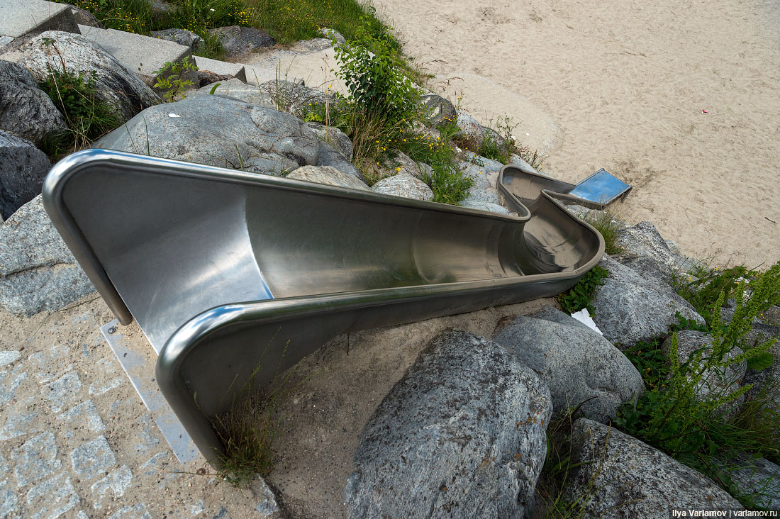 Там же. У нас такую горку могли бы счесть слишком скучной для детей и выкрасить в жёлто-сине-красный.