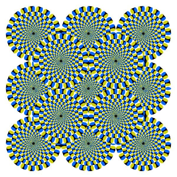 Поверьте, на этом изображении ничего не двигается. До сих пор нет научного объяснения феномена движущейся иллюзии. Некоторые ученые считают, что это связано с непрерывным «дрожанием» глаз: непроизвольные движения глаз создают иллюзию движения объектов на которых вы сфокусированы. Другие убеждены, что когда вы смотрите вокруг изображения, детекторы движения в вашем мозгу путаются из-за динамических изменений в нейронах и думают, что вы на самом деле видите движение.