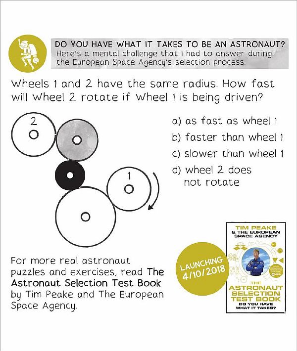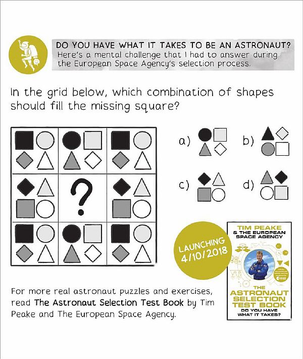 Об этом сообщает Тим Пик, которому пришлось преодолеть немало трудностей, чтобы стать астронавтом. К примеру, при прохождении отборочного тестирования в Европейское Космическое Агентство он должен был решить логические задачи, которыми поделился в своей книге «Отборочное тестирование астронавтов: есть ли у вас то, что требуется?»
