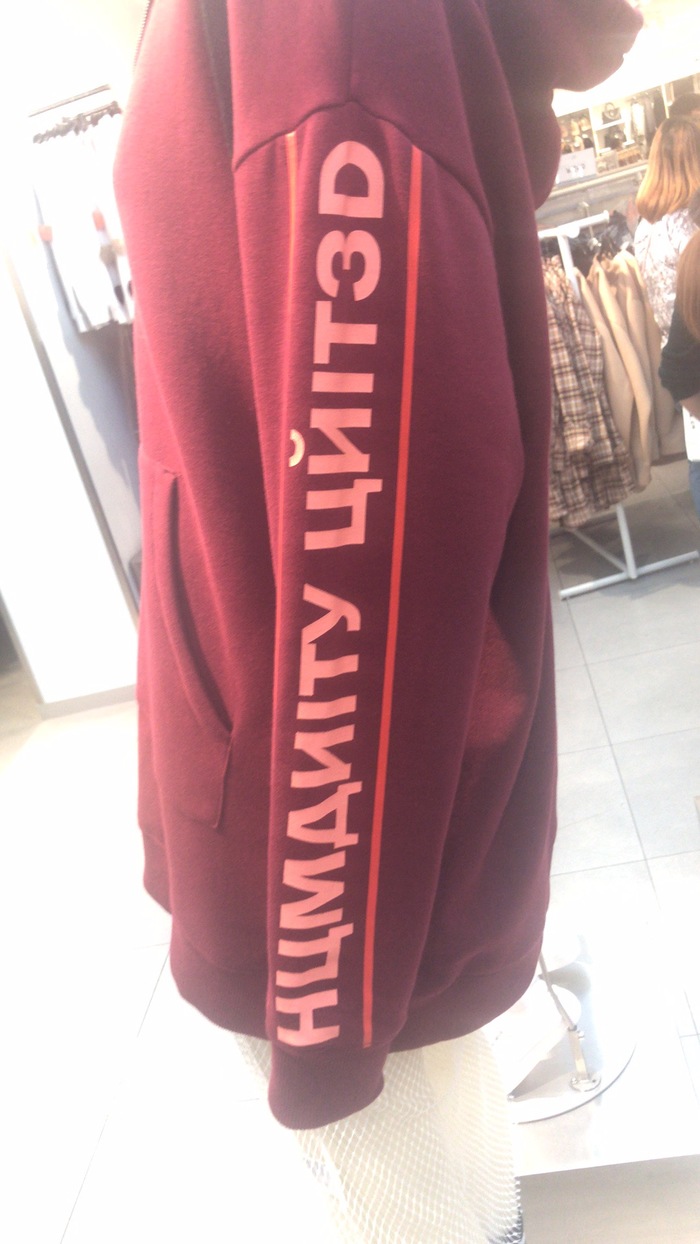И вот в одном замечательном магазине я увидел такую кофту. Сфоткал. И долго смеялся над тем, как они просто накидали абсолютно рандомных русских букв, думая, что в этом есть какой-то смысл. И знание русского языка тут меня как раз и подвело.