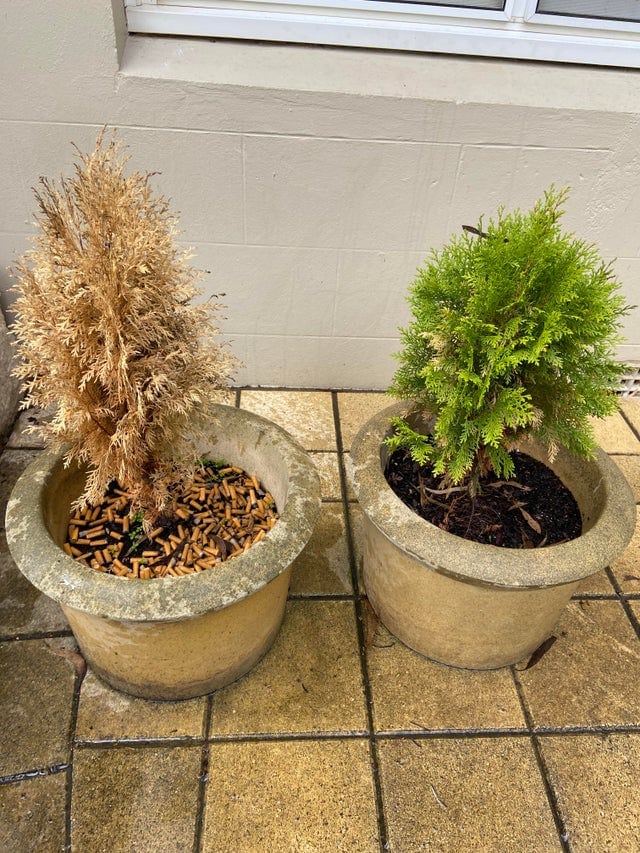 Два одинаковых растения, но в горшок одного из них бросают окурки