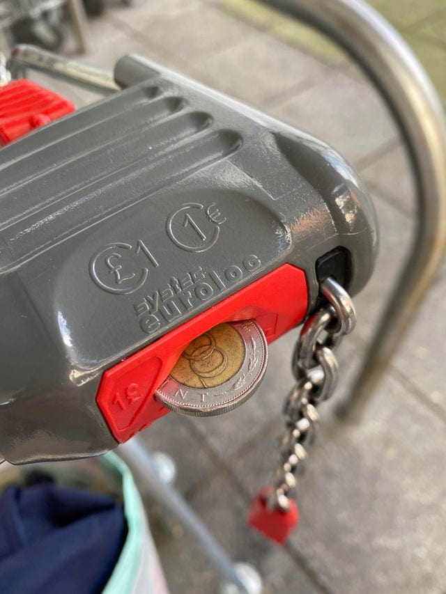 Кто-то вставил неподходящую монету, она застряла, не позволив использовать не только эту тележку, но и все, которые стоят перед ней