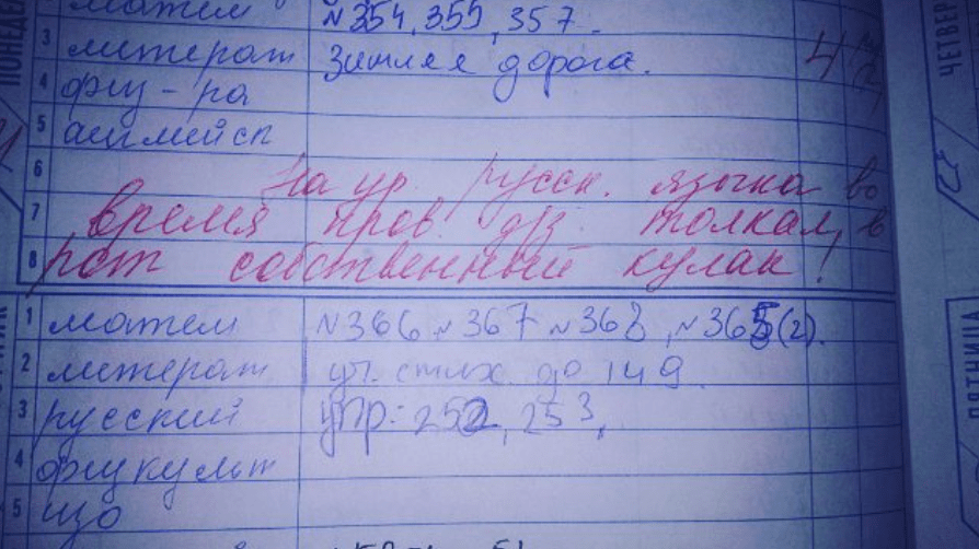 Запись замечания в школьный дневник (нередко предполагающая и пламенное послание родителям) — самая частая мера, которая позволяет привести учеников в чувства. Однако нередко учителя, находясь в плену негодования и раздражения, оставляют на полях крайне странные и смешные записи. Предлагаем вам тоже взглянуть на них и поднять себе настроение!