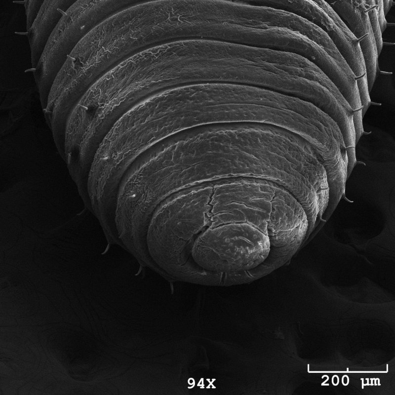 Эта странная завитушка — голова червя, которого можно встретить после дождя на дороге. На этом снимке показаны 5 сегментов бескостного животного и даже его рот.