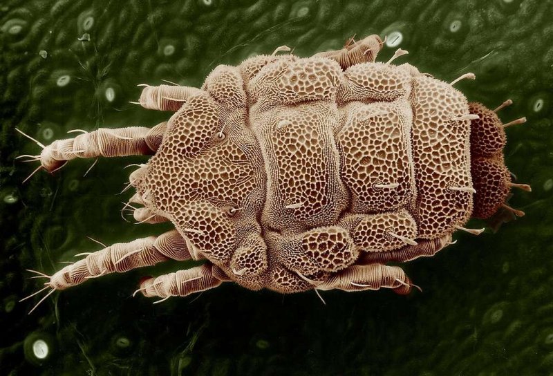 Этот симпатичный желтый клещ, на самом деле — вредитель. Он живет на листьях плодовых деревьев и любит грызть их. Настоящий размер этого членистоногого всего 0,31 мм, а изображение увеличено в 200 раз.