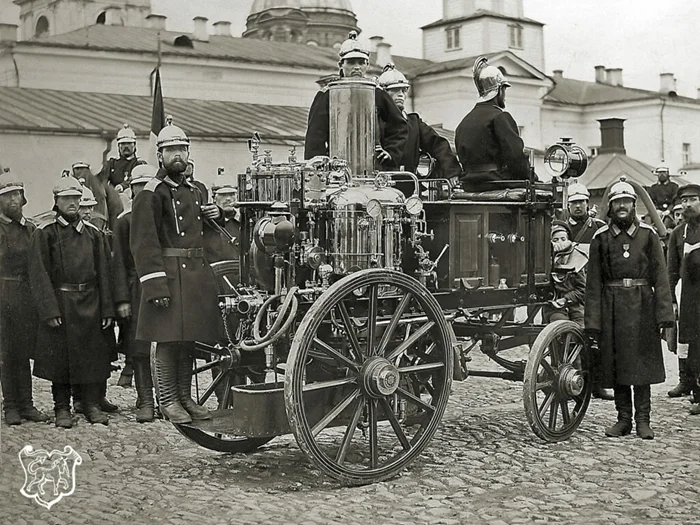 Первая в городе паровая пожарная машина во дворе Второй полицейской части, из-за которой выглядывает уничтоженный впоследствии Воскресенский собор