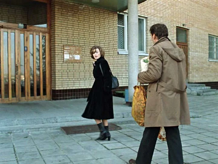 Видим, что Катя живёт в многоэтажной башне жёлтого кирпича. По современным меркам эти дома выглядят совершенно обычно. Однако в 1979 году тренированный взгляд москвича сразу видел элитные дома улучшенной планировки для высшего партийного и государственного аппарата. Коненчо, из жёлтого кирпича в СССР строили не только элитные дома. Пресловутые хрущёвки тоже из жёлтого кирпича, а в 60-х хрущёвки «нарастили» до 9 этажей. Но это всё для «обычных работяг». Для элиты строили иначе. Дело-то было вовсе не в кирпиче, а во внутренней планировке. Да и внешне, по отделке балконов, да даже по характерным стеклянным дверям подъезда, любой москвич сразу увидел бы, что дом, в котором живёт Катерина – это дом «не для простых».