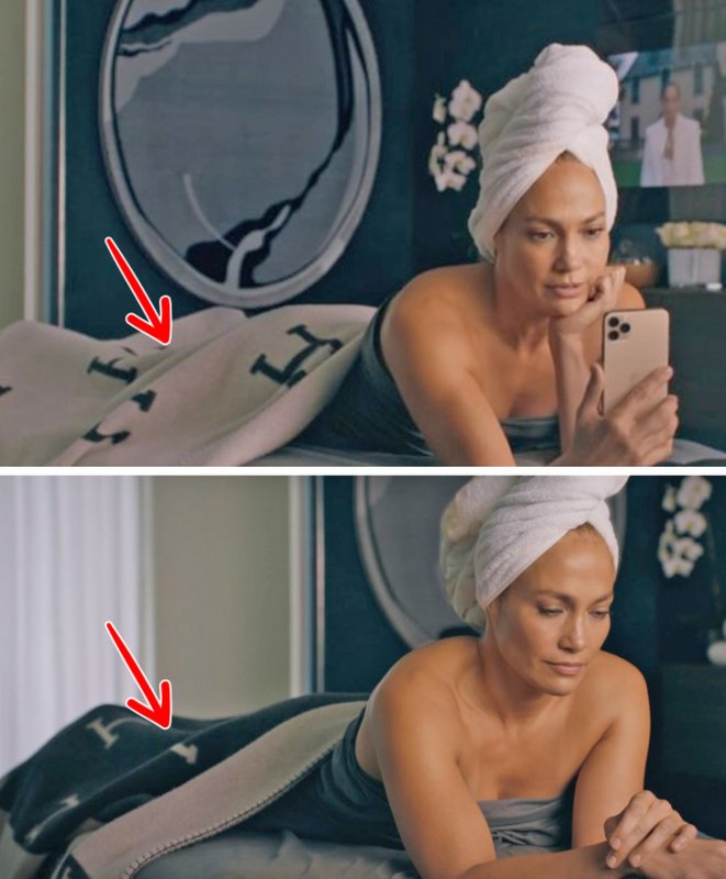 В комедийной мелодраме «Первый встречный» героиня Дженнифер Лопес наслаждается спа-процедурами, а цвет одеяла на ней меняется каждые пол минуты. Удивительно, зачем на площадке несколько похожих одеял?