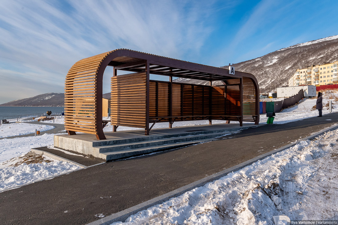 21. Вот так выглядит тут новая остановка. Симпатичная, но немного странно ставить продуваемую всеми ветрами остановку в городе, где среднегодовая температура -2,7 градуса и где в году только 5 относительно тёплых месяцев.
