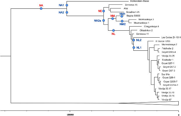 Образцы Денисова-15, Мезмайская-1 и Складина-I-4A, по мнению исследователей, соответствуют гаплогруппе NE. А три неандертальца из Денисовой пещеры (E202, E213 и M65) относятся к гаплогруппе NA2a, а не NE, как это было предложено ранее. Примечательно, что геноме неандертальца из Тешик-Таша исследователи нашли варианты, относящиеся как к NA1, так и к NA2.
