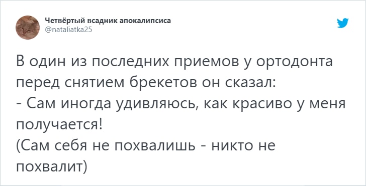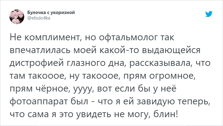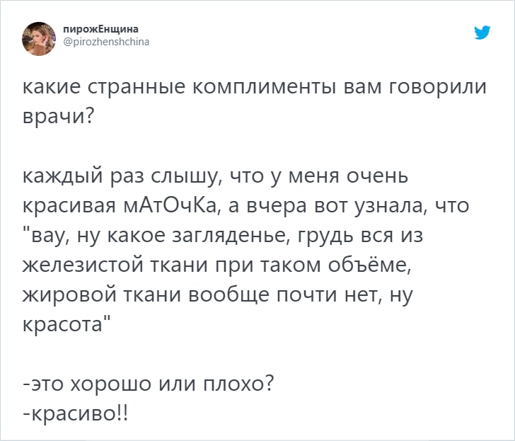 Идею предложила пользовательница под ником пирожЕнщина. Она привела примеры своих необычных диалогов с врачами, которые оценили её богатый внутренний мир и не забыли поделиться своими восторгами с пациенткой. Ну а в комментариях свои истории рассказали и другие пользователи соцсети.